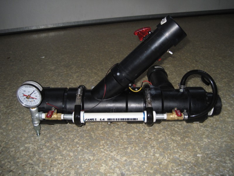 The cannon is mixed PVC/ABS, the combustion chamber being the ABS part, and the barrel is PVC. I used 3 inch for the combustion chamber, with a threaded 2 inch connector for the barrel.