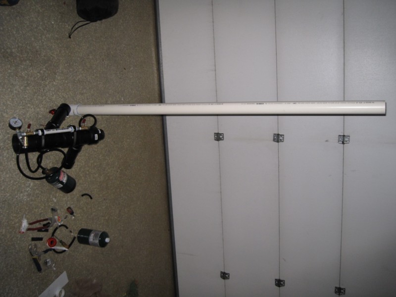 The cannon is mixed PVC/ABS, the combustion chamber being the ABS part, and the barrel is PVC. I used 3 inch for the combustion chamber, with a threaded 2 inch connector for the barrel.