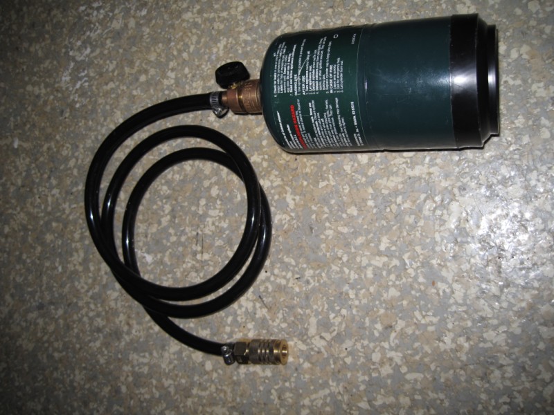The fuel is propane, through a metering system made out of 1/4" galvanized fittings, 1/2" PVC, and some black acrylic tubing. I made a long hose coming from the propane tank, which ends in a compressor fitting for easy removal, so I can leave the tank on the ground. The pressure gauge is upside down at the moment, and I intend to get a different one as soon as I have the cash. I also used tubing to go from the second valve into the chamber, in lieu of using an elbow fitting. If anything goes wrong it is easier to disassemble this way.