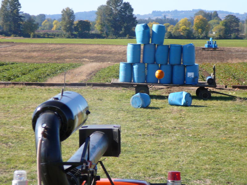 At 140 psi, Nietubicz' pumpkin bursts inside the tube, emerging from the 65-foot barrel of his air cannon looking like the old Atari game "Asteroids."