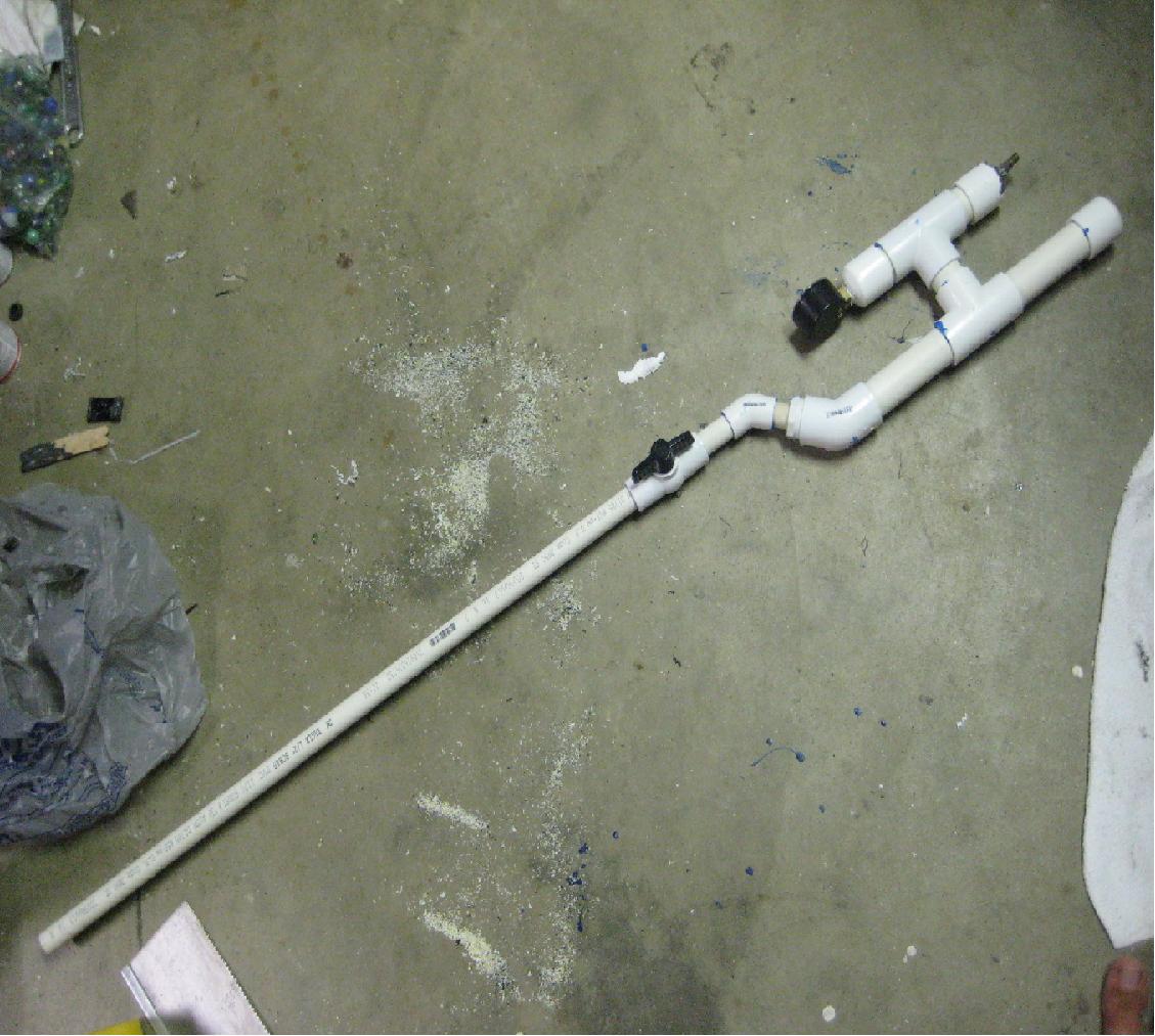 this is my first pneumatic and second gun, the chamber is about 16-18" total of sch 40 pressure rated 1" PVC, but because some of it is above it is a little over 1' long. the barrel is just under 2' 6", the valve is a half inch ball valve, the schrader is from a bike tube and epoxied in with J B weld, which seems to not stick good to rubber but still made a seal, but needed to be fixed.I got all parts but the schrader and ammo at Lowe's, and I used all in one pvc "blue glue" to seal the parts together.