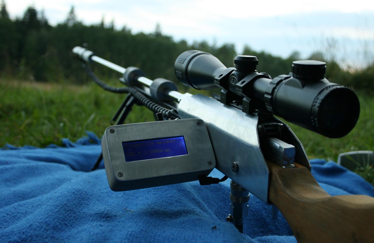 The chronograph started as a side project were I first had to learn how to program a microcomputer and having it perform the task of reading sensors and present the info on a display. It ended up being an on board velocity measuring unit. The limitation of the speed measure is not yet known but the microprocessor can measure microseconds (0.000001 seconds) and should do the Ir sensor the weakest link. The Ir sensor itself needs 15microseconds to register a bullet. So with 8mm ammo the highest theoretical speed would be 533m/s (1748 fps).