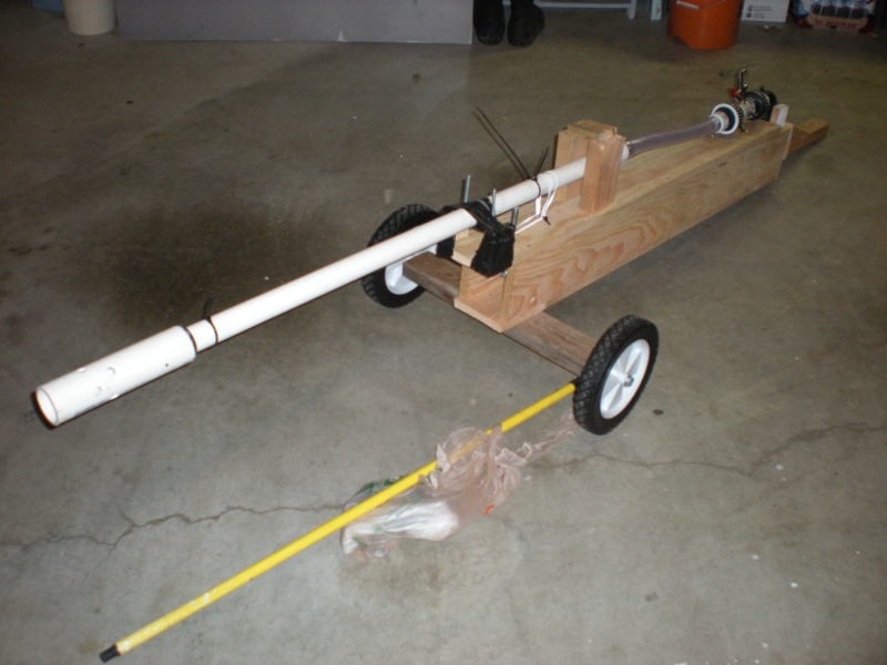 Anyway, it has a 46 inch, 1.25 inch barrel and a 2 inch by 44 inch air chamber. We also can raise and lower the barrel because we used pvc hose to connect the barrel to the action. I decided to try an new firing mechanism that I read about online; the piloted burst disk. If you don't know what that is there is a description. Sorry i posted the pics backwards.