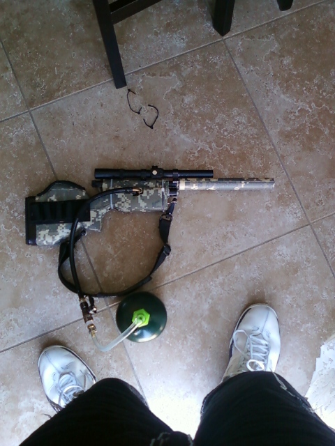 Hope this is a somewhat valid double post :oops: I got some new pics, i also rigged up a propane setup that will be in my ACU backpack, added the scope, soft butt pad, soft cheeck rest, and ammo holder on the side. Zip ties are only until i get more superglue or epoxy to hold everything together.