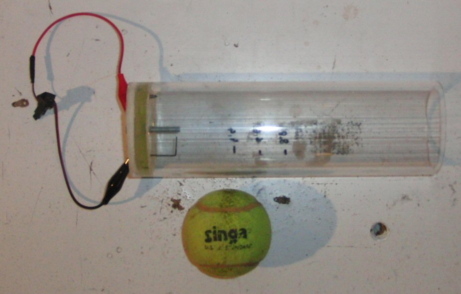 I recently changed the dessicant cartridge on our FT-IR spectrophotometer at work, decided to keep the acrylic tube it was housed in. Turns out it's a perfect fit for a tennis ball, so I made a simple launcher (ie closed one side with an epoxy endcap fitted with electrodes) do do some high speed testing.