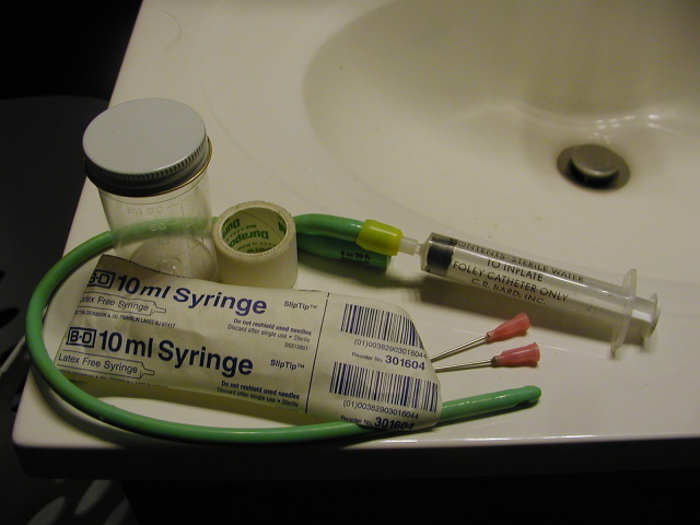 Hazardous materials include an expired date catheter, a specimen sample jar, hypodermic needles, single use syringes, and the contaminated left over roll of tape.