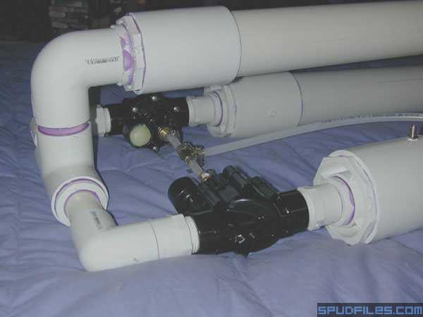 As a way of getting my feet wet, I built an simple over-under design using a 3/4-inch sprinkler valve, but its performance was very disappointing. It was obvious that the solenoid and low flowing sprinkler valve was the bottleneck in the design, so I built the second generation using two Rain Bird CPF-100 one-inch valves in parallel and used pneumatic triggering. Both feed into a 1-1/2-inch T which leads to the 2-1/2-inch barrel, which just happens to be the right diameter to fit a tennis ball. The U-shaped pressure chamber is made of 3-inch tubing with two 90-degree elbows. All tubing is schedule 40 PVC and is rated to over 200lb. The barrel length is about 47 inches, while the pressure chamber is about 32 inches long. By my calculations, the barrel has a volume of about 220 in 3 and the chamber 530 in 3 for a ratio of about 2.4:1.