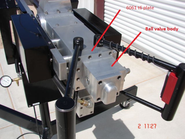 The 4x4x1 back plate seals the 2" piston bore. The back plate has a .500 pilot hole bored completely through the plate. The ball valve is shown bolted to the backing plate. When the piston retracts, the PVC plunger enters the .500 pilot hole in the back plate and slows the discharge through the ball valve....thus slowing the pistons retract speed.