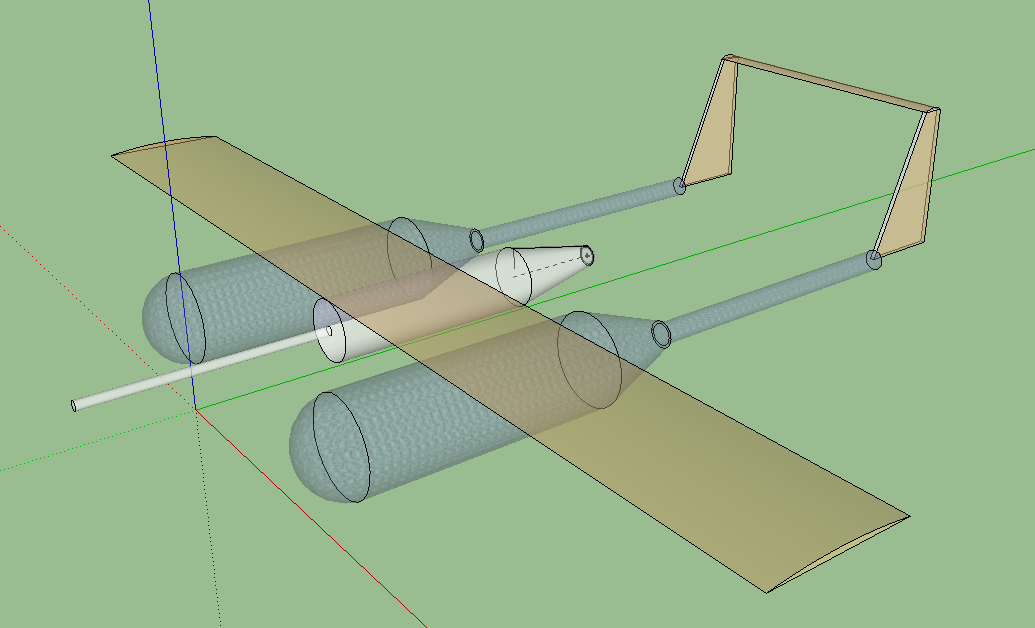 The twin booms are principally composed of two 2 or 3 litre soda bottles which are also the air tanks, filled to 150 psi or so.