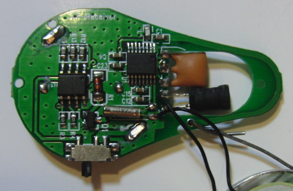 Some close up pictures of the transmitter and receiver. The bit of wire around the receiver board is something I added as an antenna. I tried bending it in various configurations, unsurprisingly having it straight worked best. Range increased about three times that in standard configuration.