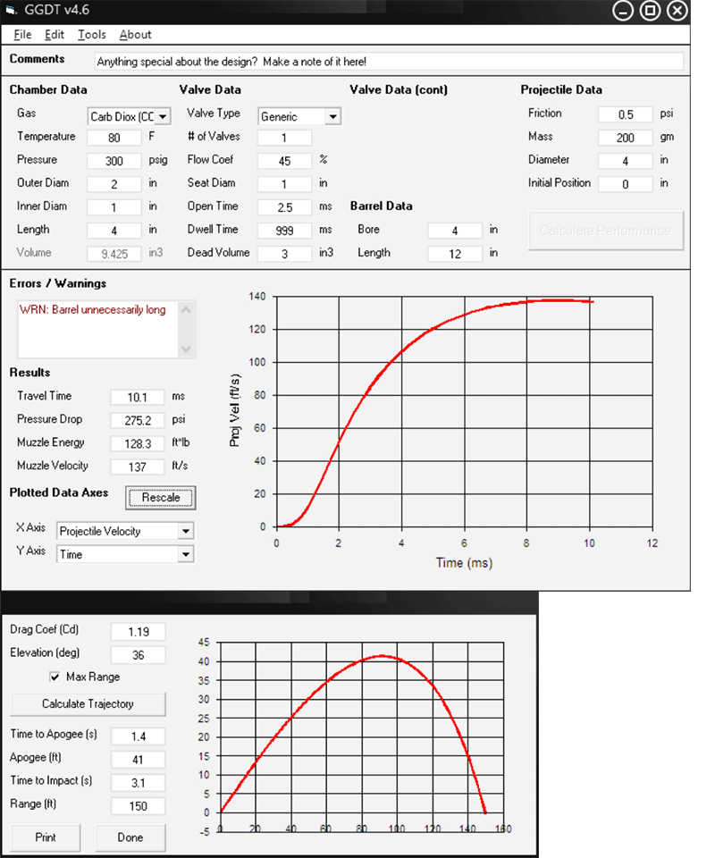 I fine tuned it a bit. I changed the drag coefficient to 1.19, used CO2 instead of air. That gets it to 150 feet to match their advertised max distance. Now I can better design my t-shirt launcher. Thanks!