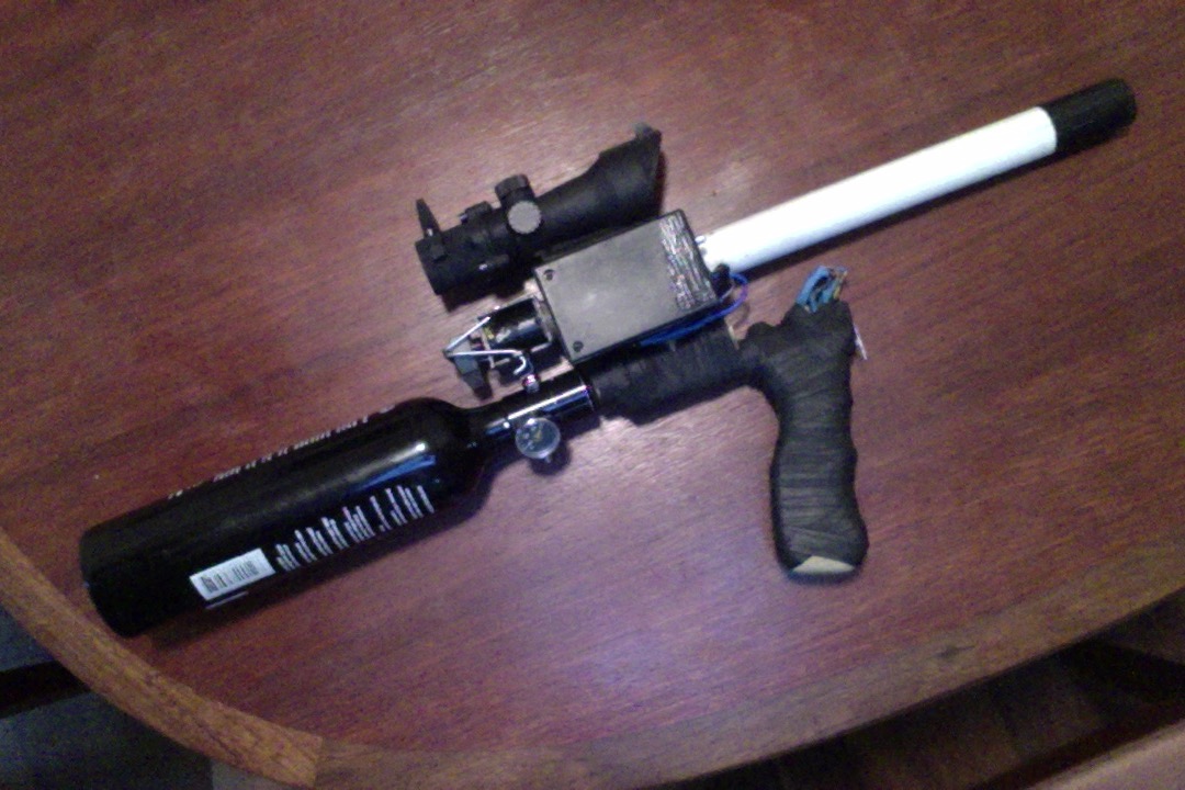 I took apart the "finished" gun that I posted a few months ago and rebuilt it to feed directly from the regulator paintball style.