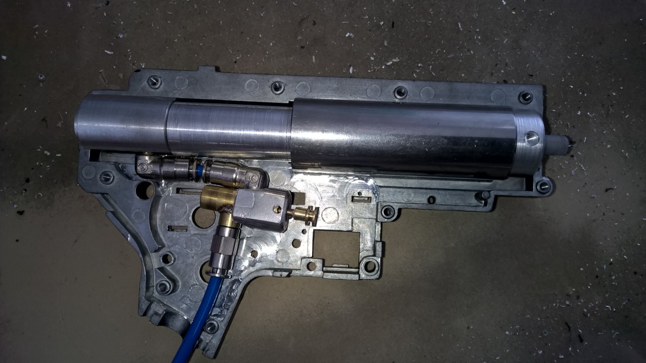 So, I ended up following a blow forward bolt design I saw here somewhere then added a coaxial piston valve piloted by a homemade 3-way as firing mechanism. The hardest part was definitely the 3-way, but all worked. Blow forward nozzle is the worst functional part, but for a first time attempt I'm happy it all worked, No leak everywhere
