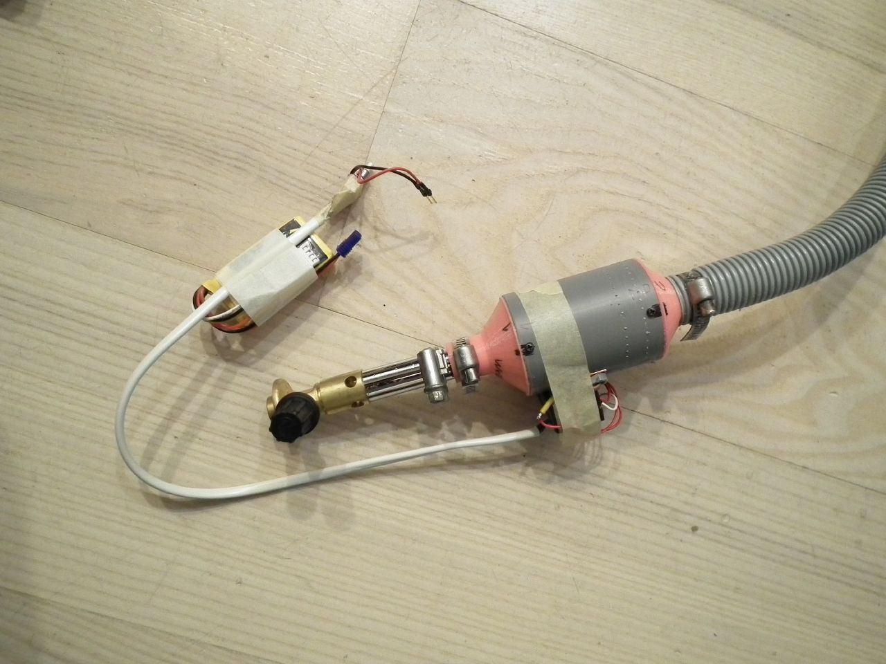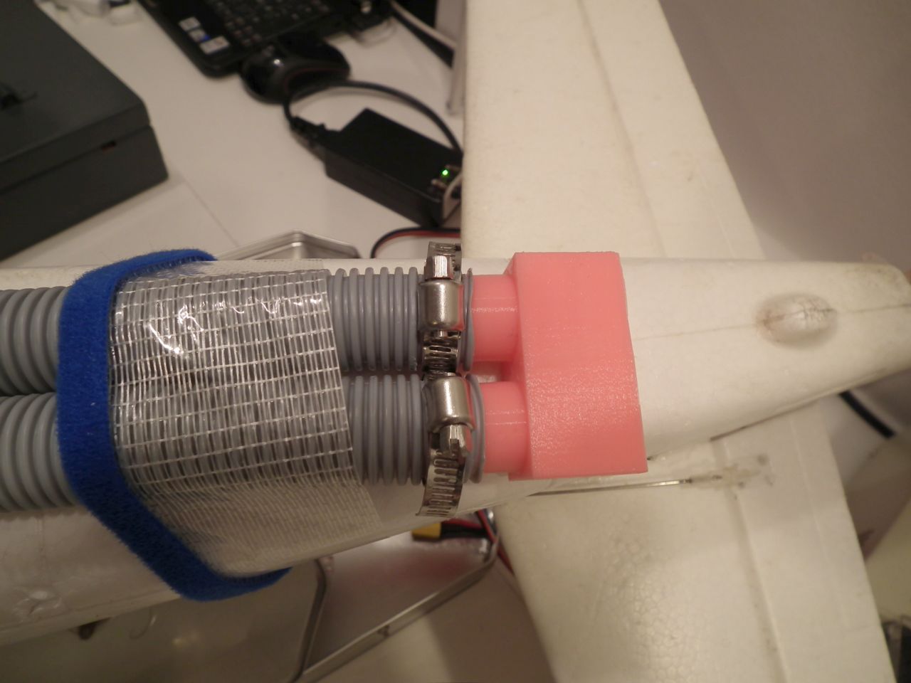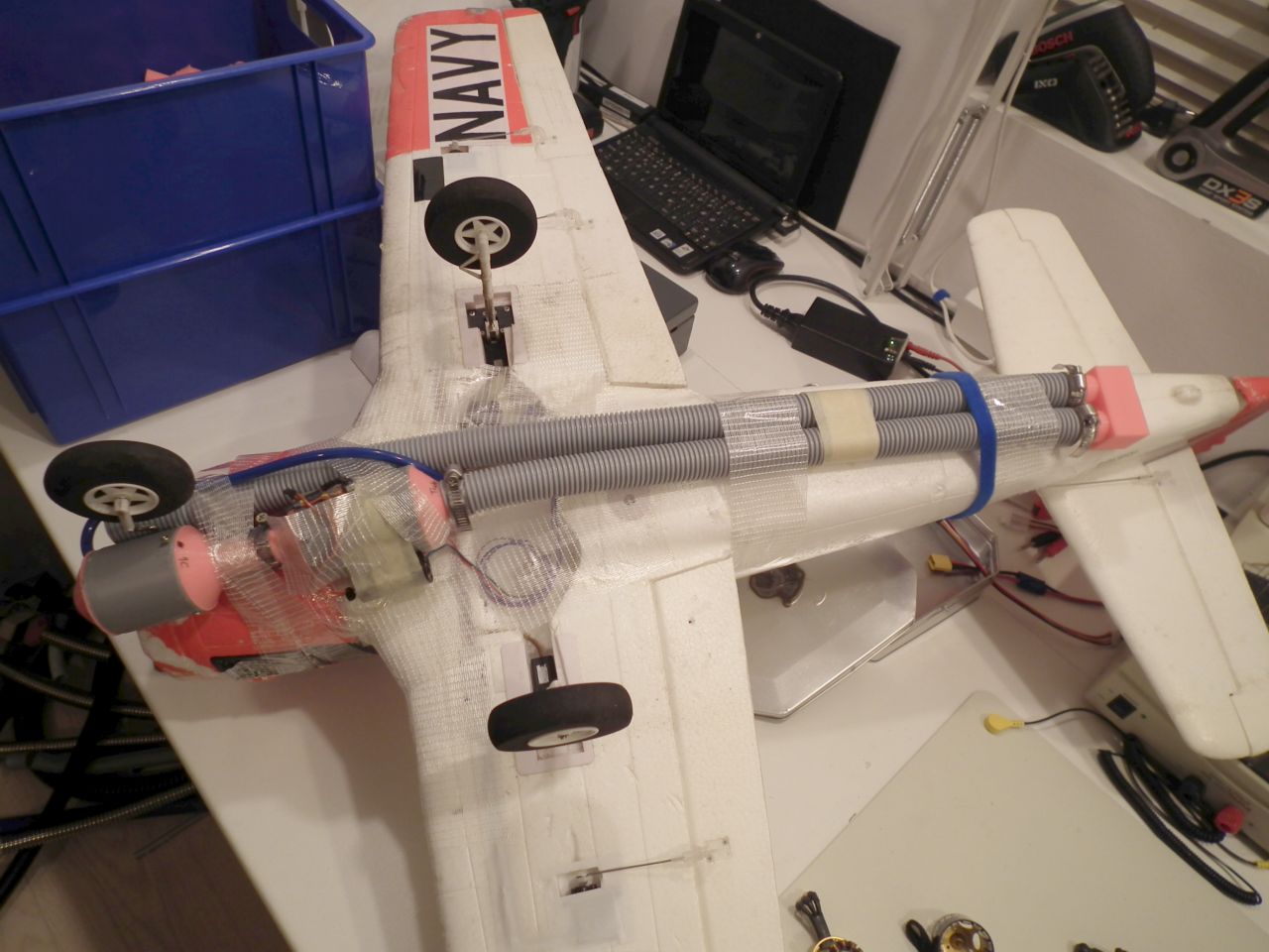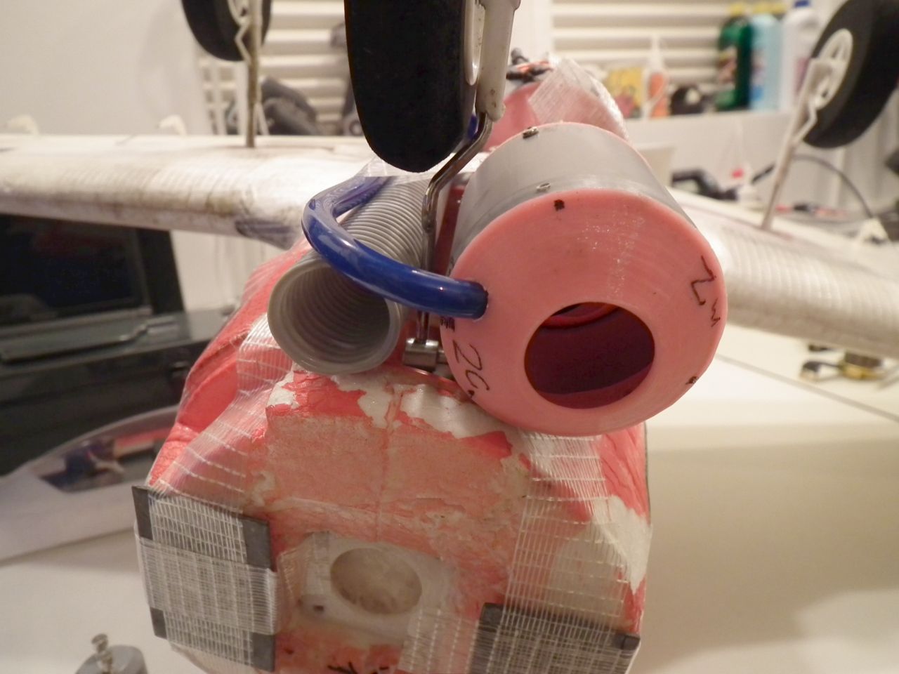 I just took some photos of the installation. The plane was a model I had crashed previously and was not the most suitable for the job, but I couldn't wait to test it in the air any longer so I fixed the plane and installed the sound cannon.