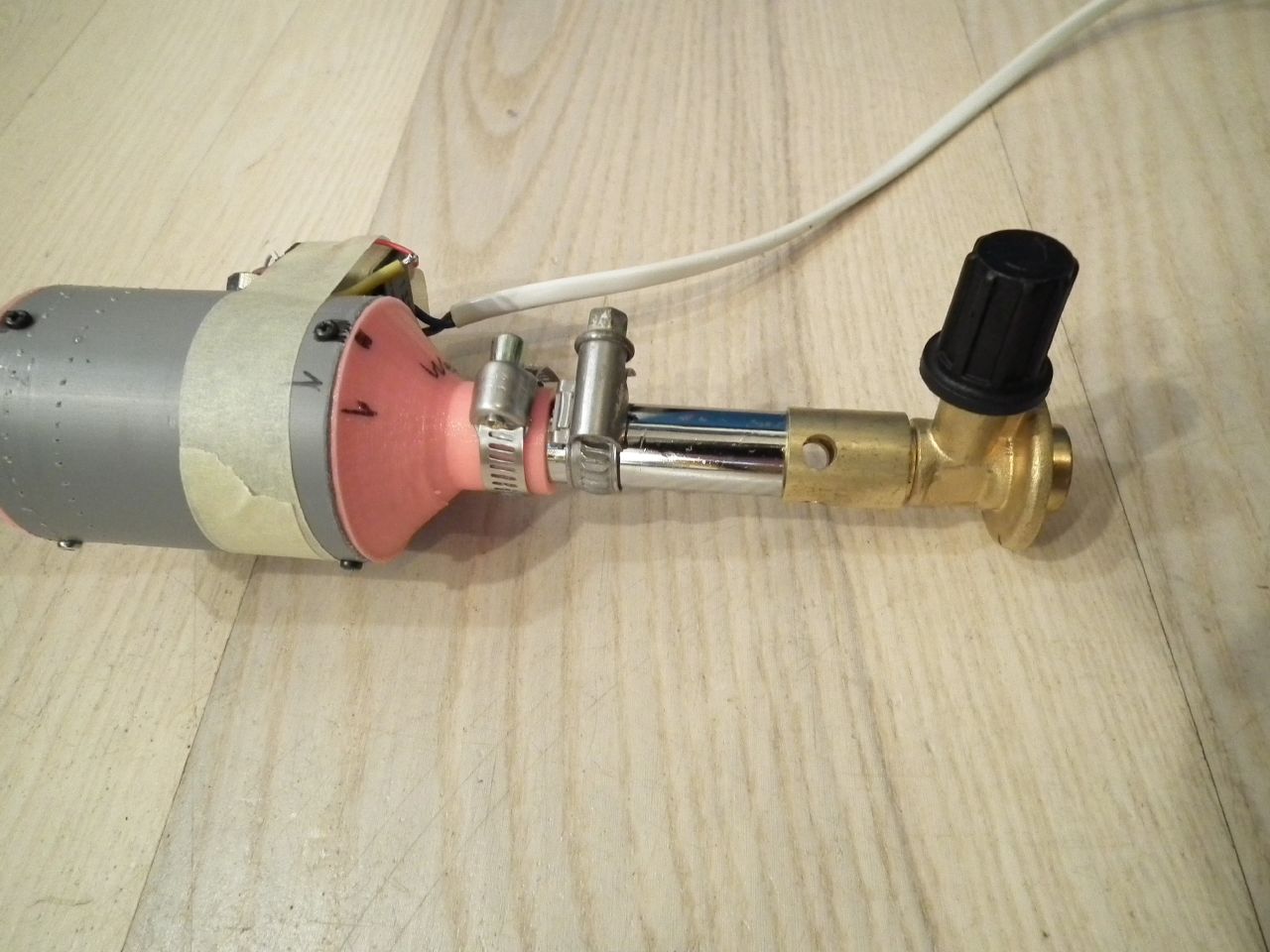 So I came up with the idea of using a throttle valve (like the one used on a carburetor) as an inlet valve, I was thinking I could easily control such a valve with a motor or fast RC servo. So I did a test (using the proven weed burner) where I fired the noise cannon with the valve open, and one where I close the valve with the gas still flowing and igniting very quickly after closing the valve. The result is very strange, I get a lot bigger boom with the valve open, and I can see a much bigger exhaust flame when the valve is open. I would have thought is was the other way around!