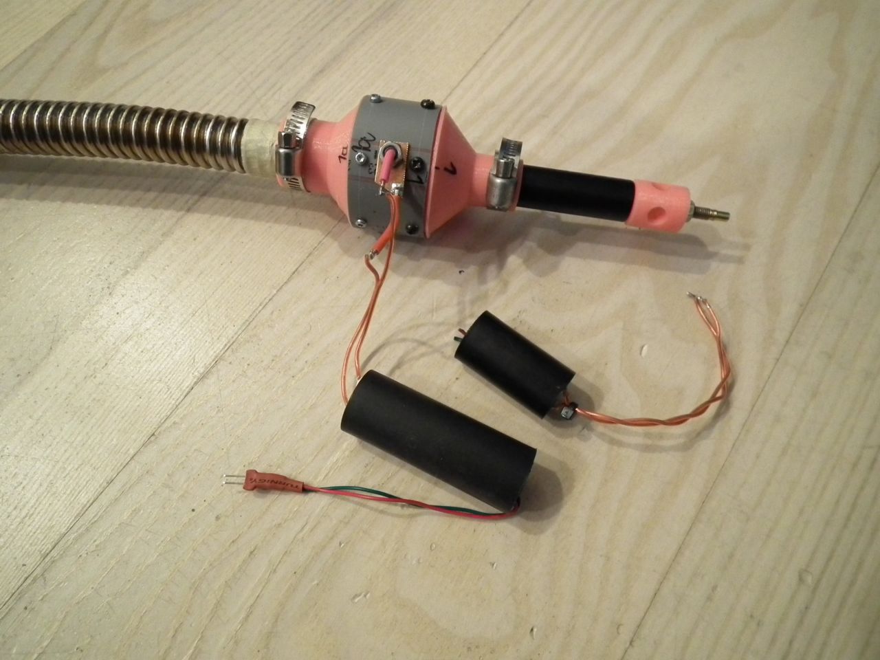 During my testing of gas burners, I wanted to try out a weed burner. So I bought one on sale and cut away the long and bent part of the tube so it would fit my initiator chamber. I was surprised how well it worked! And it's dead simple, more simple than the Express burner. So I hooked up one of my HV modules to my new homemade spark plug and mounted the spark plug in the middle of the initiator tube. The HV module is powered by a small LiPo cell with a switch for ignition. The long main tube is 120cm.