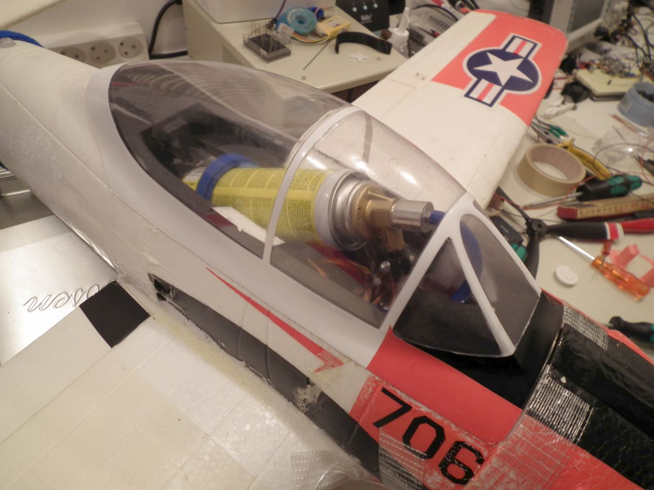 I just took some photos of the installation. The plane was a model I had crashed previously and was not the most suitable for the job, but I couldn't wait to test it in the air any longer so I fixed the plane and installed the sound cannon.