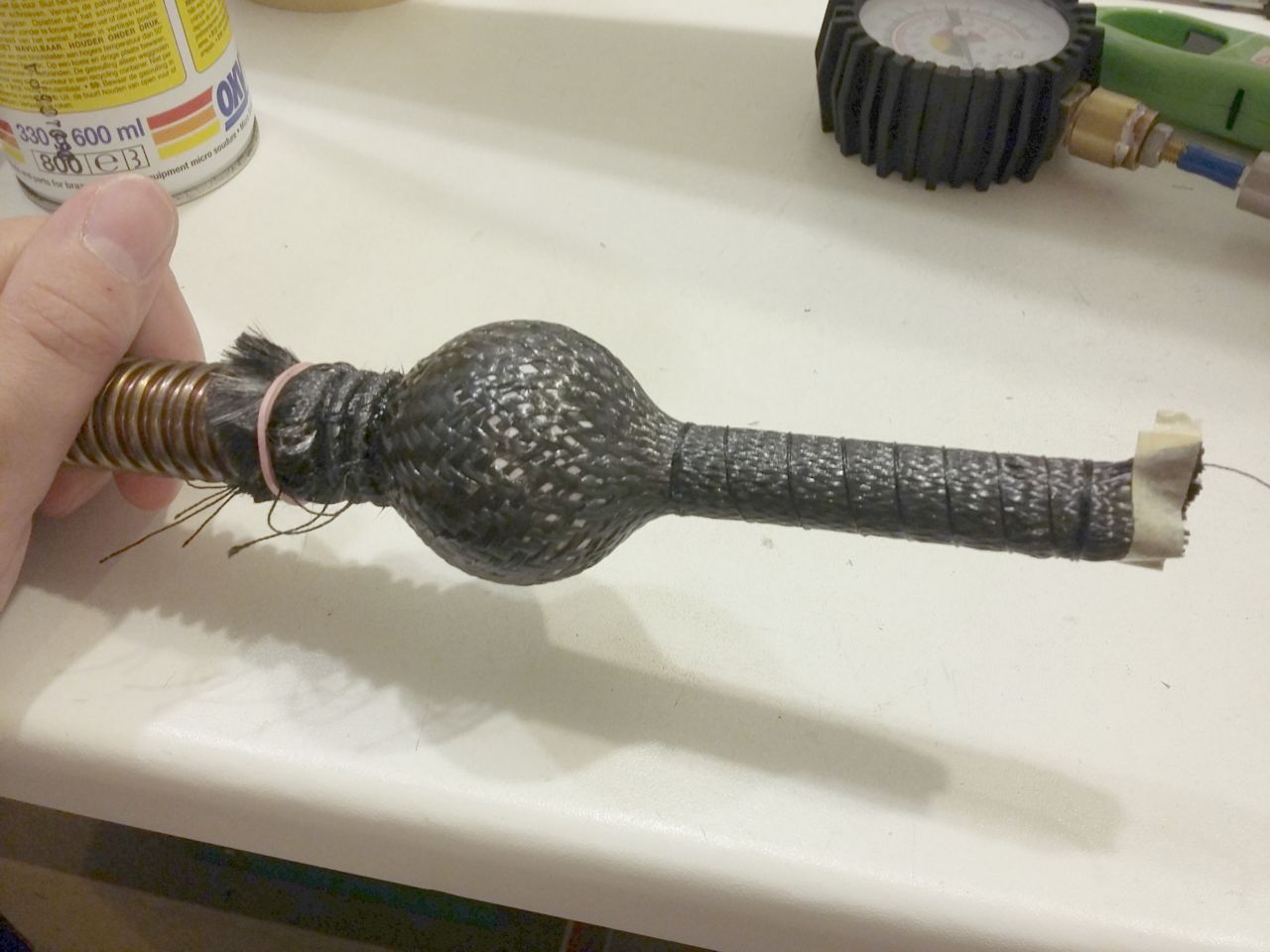 Then it suddenly came to me. Carbon fiber! Lots of people make fiberglass stuff for RC planes, carbon fiber is not any different in manufacturing methods, only a different material which gives a more stiff product. I even have a guy at the club making fiberglass fuel tanks for RC jets, he gave me some hints, and I found some braided carbon fiber sleeve which would be easy to work with, and I found some affordable high temp epoxy resin. Resin has arrived, but not the carbon fiber, so I won't be making any real stuff from it before next weekend.