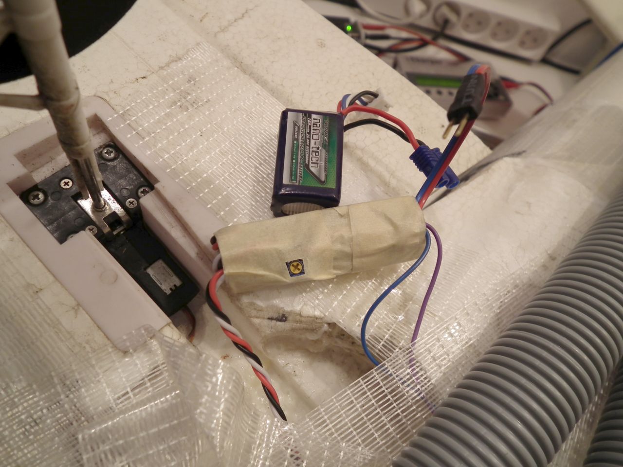 I just took some photos of the installation. The plane was a model I had crashed previously and was not the most suitable for the job, but I couldn't wait to test it in the air any longer so I fixed the plane and installed the sound cannon.