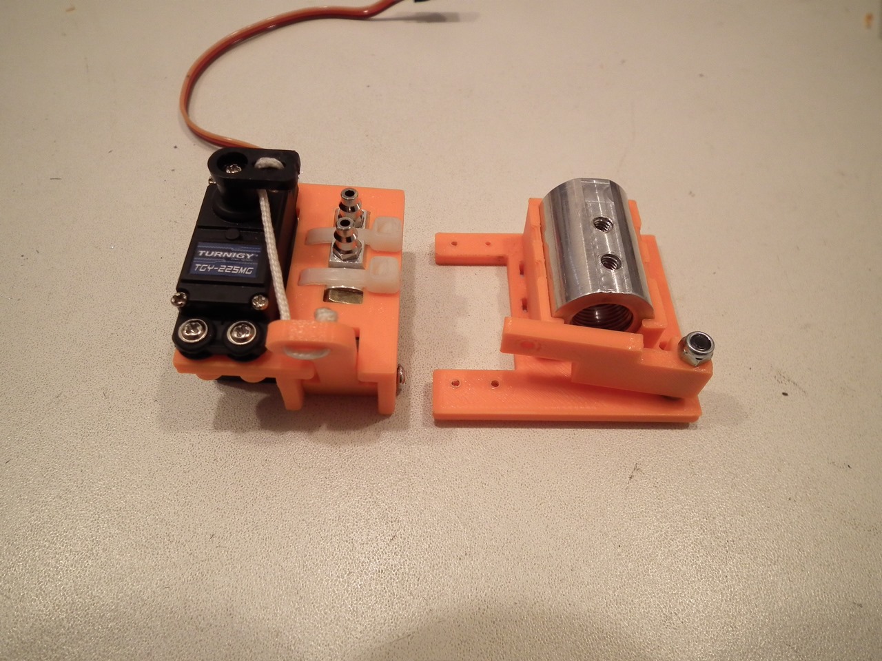 I'm not sure how I want to mount it in the plane yet. I'm thinking double sided tape on the side of the servo and a wire strap around for safety. There is no clearance for the wire strap now, but I can print a new holder if that is the method of attachment I choose.