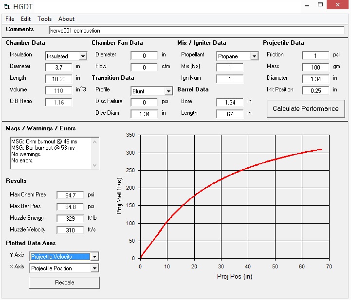 Increasing barrel length to 100 inches with the same chamber gives us 384 ft lbs. Keeping the same barrel length and increasing the chamber length to 20 inches gives us 433 ft lbs. Playing with these parameters will let you optimize the design of your launcher.