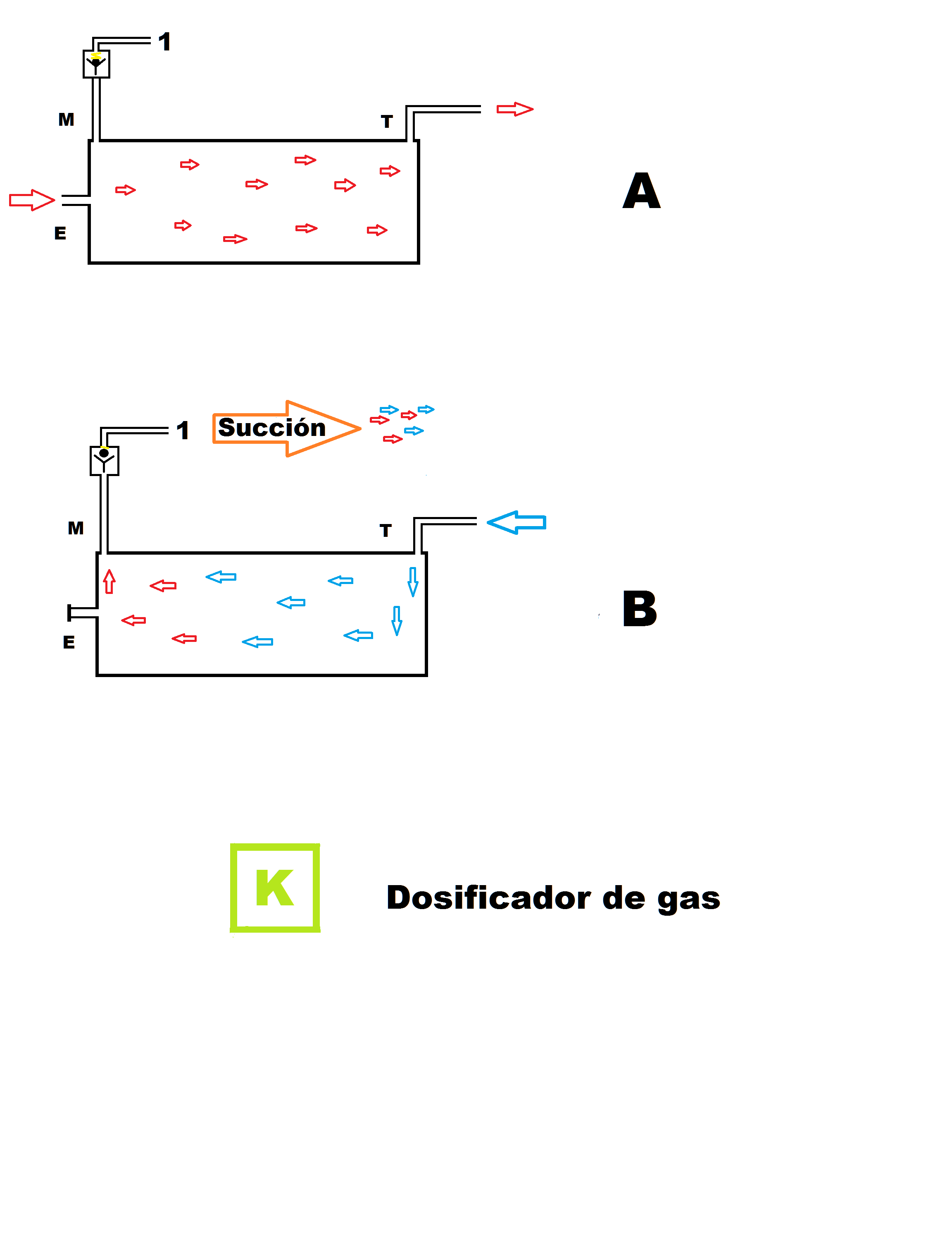 In diagram "1", position "A", as the larger piston moves to the right, the suction of the combustible air mixture is produced in the lower piston chamber (diagram "4" Gas meter).