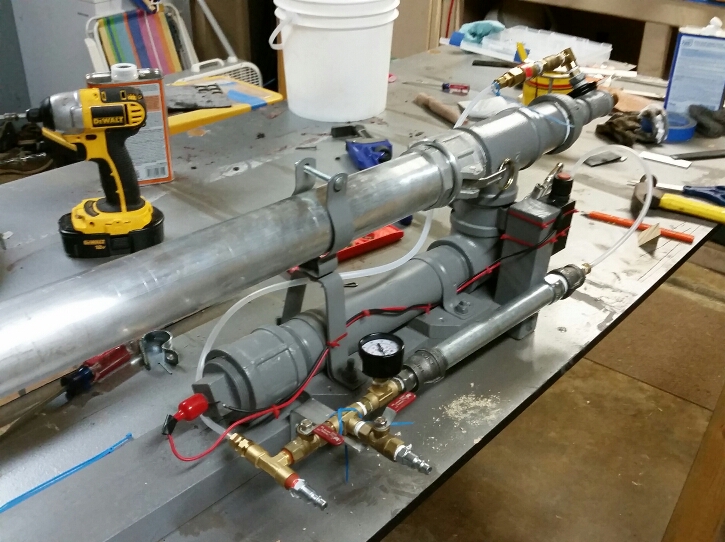 Have finally gotten it to a point where I am ready to showcase it. Steel chamber with aluminum barrel. Cam lock breech loading system. Piston made out of all thread, 2 caster wheels, o rings, and a piece of a dog toy. Shoots up to 9X mixtures at the moment. Enjoy.