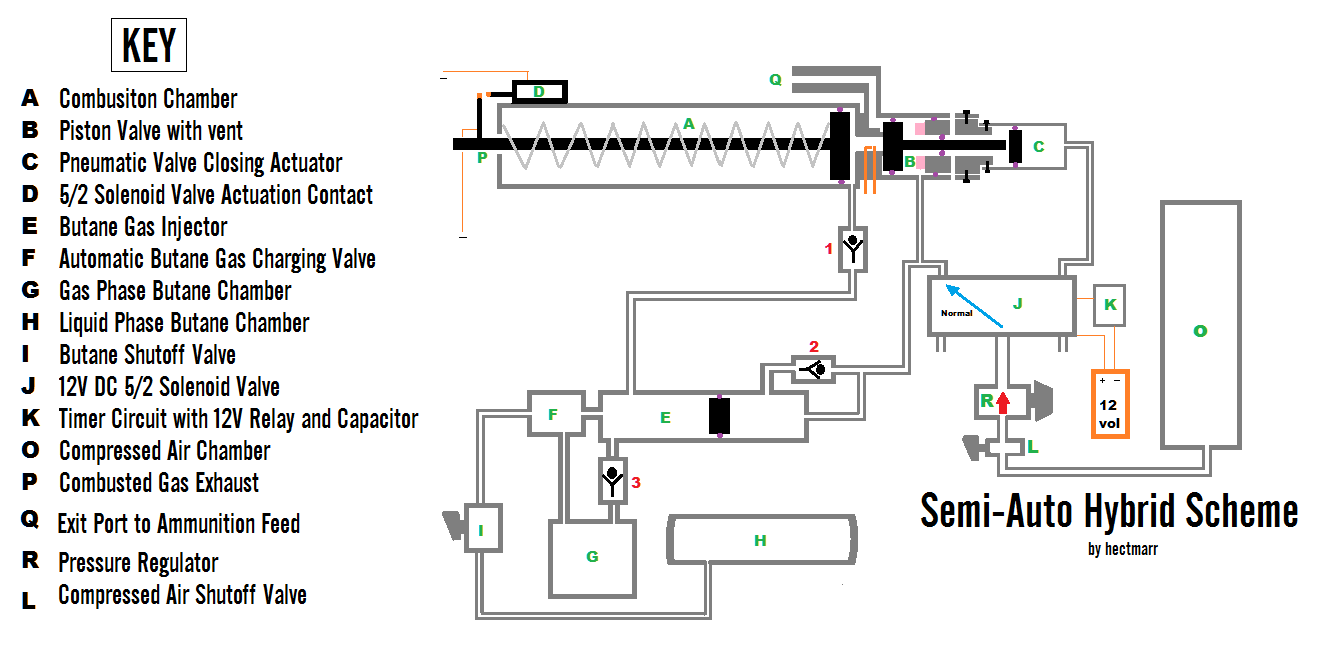 I'm trying this variant, which has no piston barre burned gases. The combustion chamber is cleaned with a little air, (I'm determining the right amount absolutely necessary), which apart from cleaning the whole cooling the whole. The solenoid valve alternates between injecting the dose of gas and compressed air, in the "norm" position, I mean NO avtivated, and the other position that is when it lets air pass through the chamber.