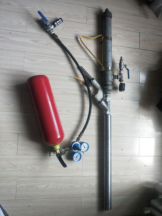Main body is made of 2' steel tube ,and I added a stock to hold the recoil.Refill set include a 3kg/6.5lbs CO2 fire extingusher which holds the CO2 ,enough for about 75 shots at 175 psi.