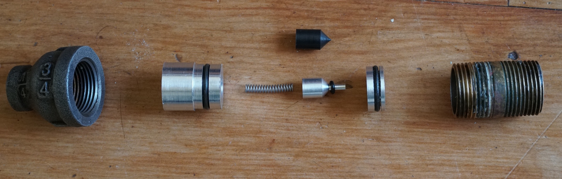 The pump is a 20mm copper pipe brazed into a 20mm fitting with a custom checkvalve built into that fitting. I aimed for 0 dead volume in the pump to improve efficiency and the maximum pressure that can be reached and think I have got pretty close to achieving that. The piston uses a double floating o-ring with a few ports to aid 'recharging' the pump on the up-stroke.