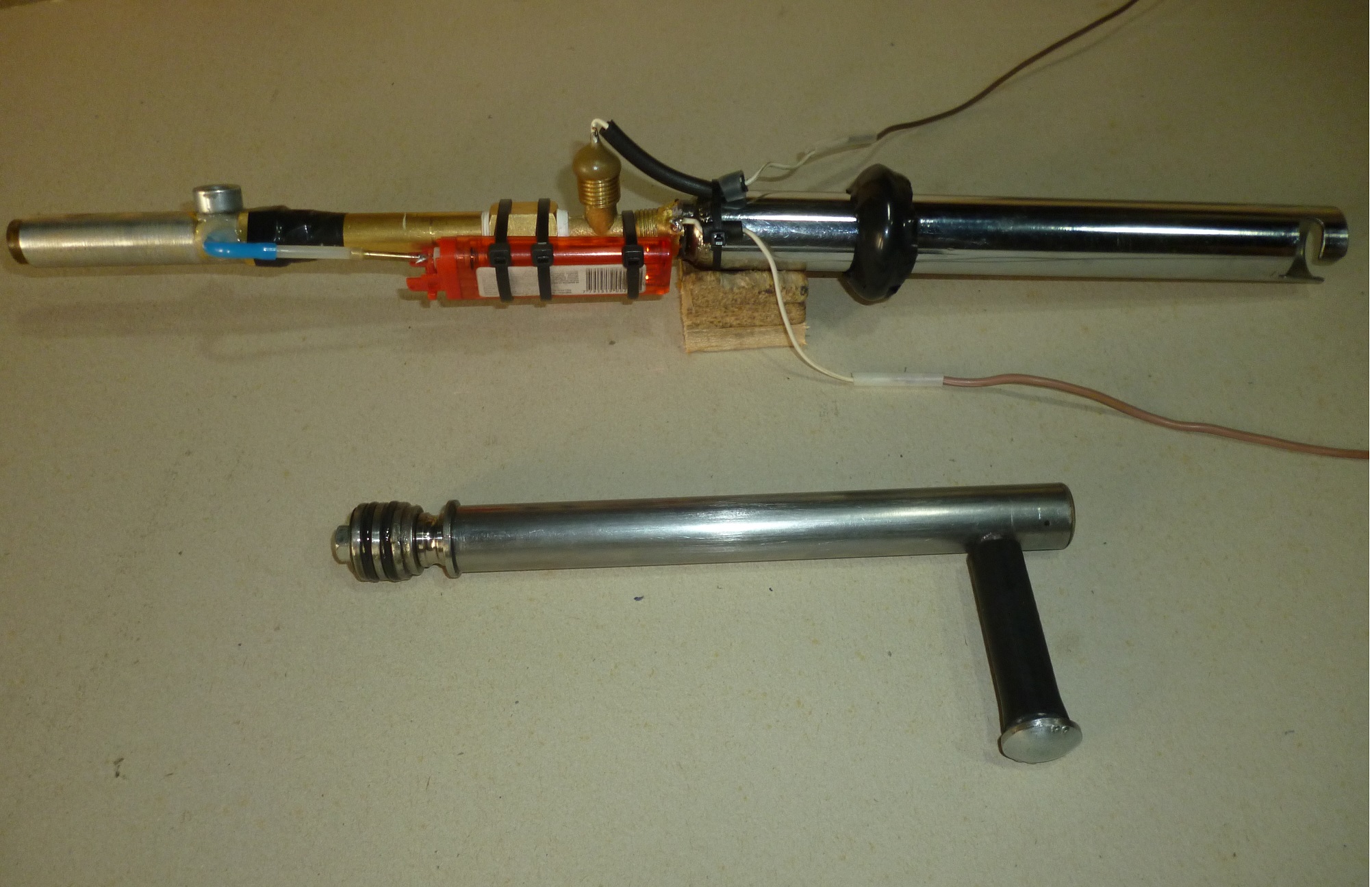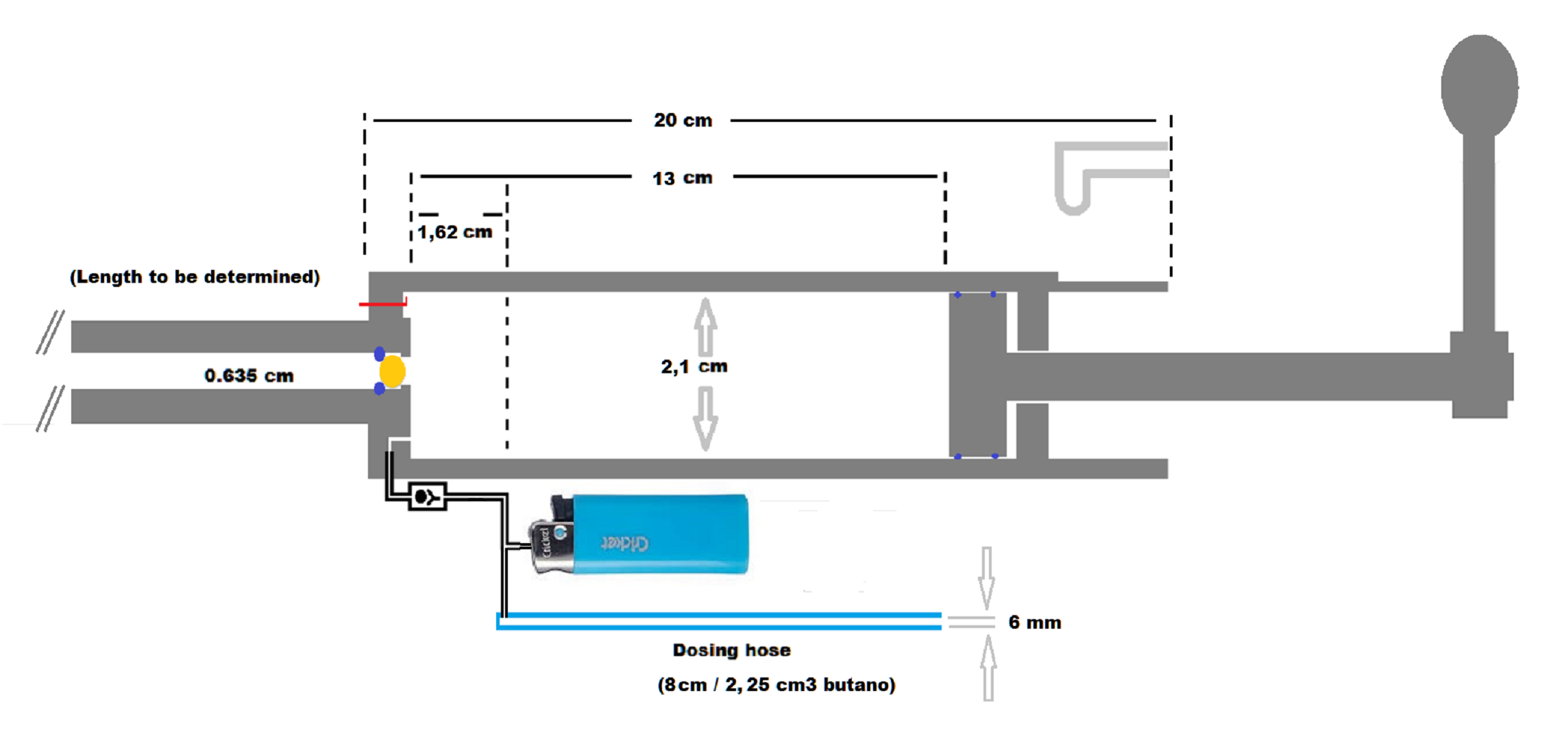 I managed to shoot several times, using as a dispenser, only the firing gun that is in 7 cm. Everything worked perfectly, and with a lot of noise. I am using a cigarette lighter as a reservoir, which must provide the 2 cm3 of butane necessary for combustion. In hybrid it is loading about 40 cm3 of air. I added a bronze tube to the gun to increase the volume of the combustion chamber and to lower the pressure to about 3 - 3.5 bar.