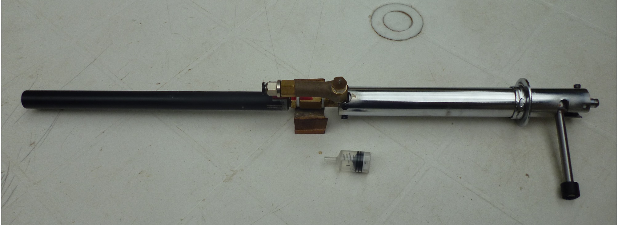 The construction is cleaner and seems to me a better idea than the other version, because in this new idea, the barrel has no limitations in terms of length, and the size of the doser is not a problem. I have added a check valve for the hybrid to suck the mixture. The retention at o´ring no longer lets air in from the barrel into the combustion chamber. Load one 40 cm3 of air.