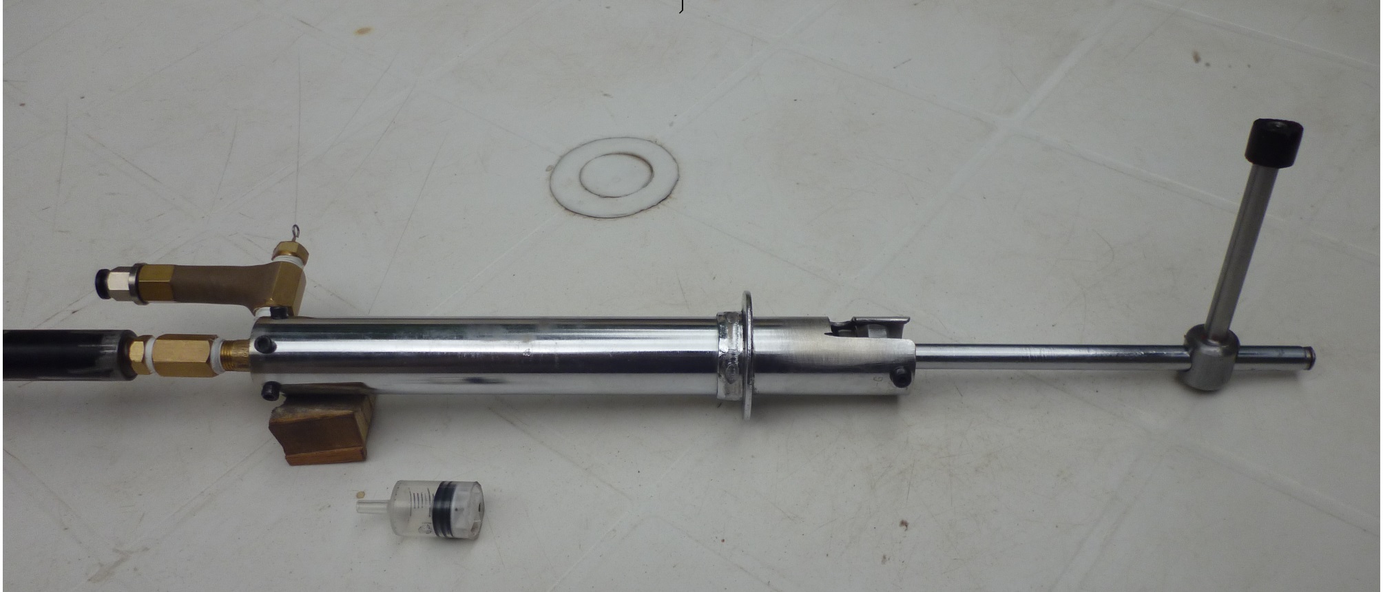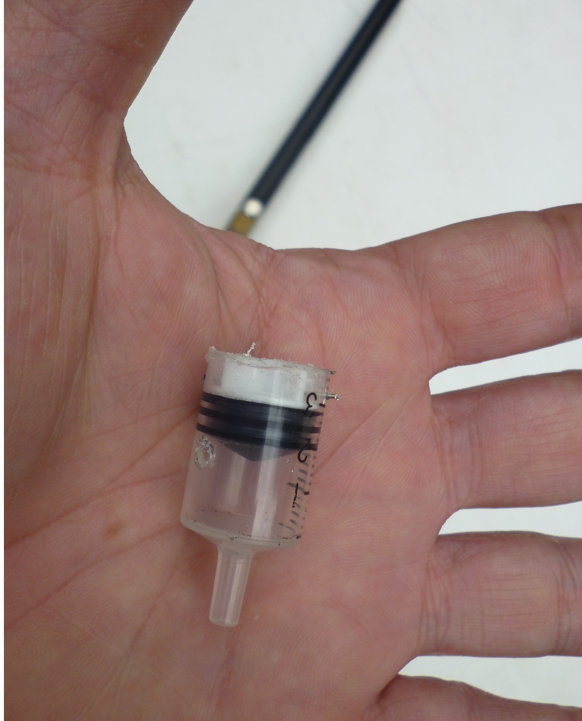 The dispenser works as in the drawing. You can use a syringe or better a piece of hose that has the necessary internal volume. The gun I show here has 40 cm of hose 4 mm outside diameter, (used for around compressed, polyurethane). In this case, 21 cm of this hose is equivalent to 1 cm3, and the inner diameter is 2.5 mm.