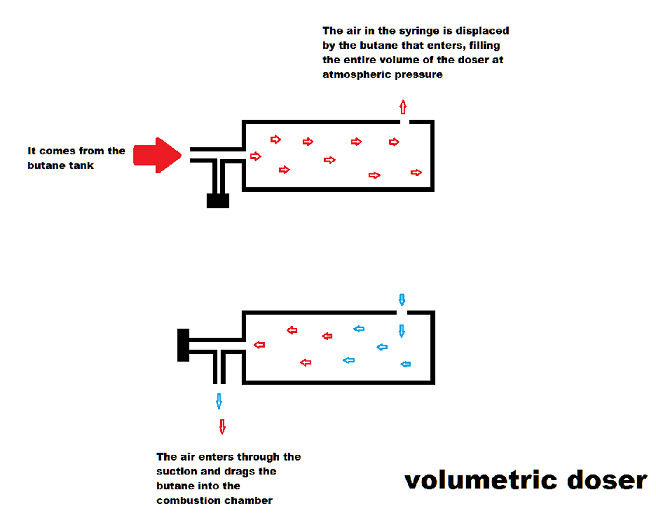 The displacement of the stem, (in black in the drawing), also serves to open and close the butane valve. The drawing of how the small 3-way and two-way valve that butane passes through is still pending, so that the concept is well understood