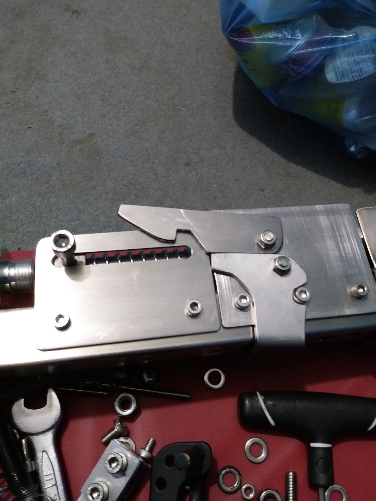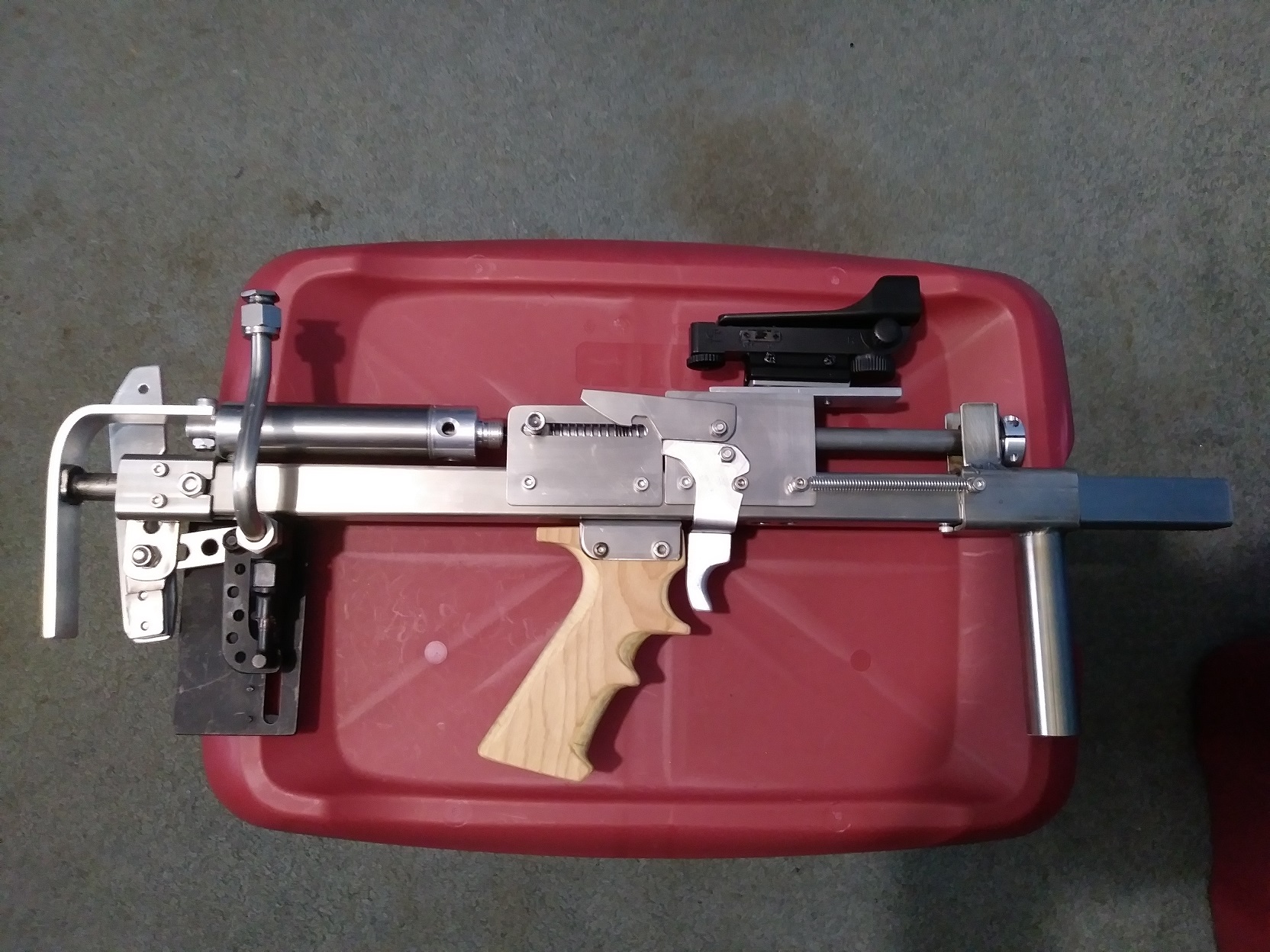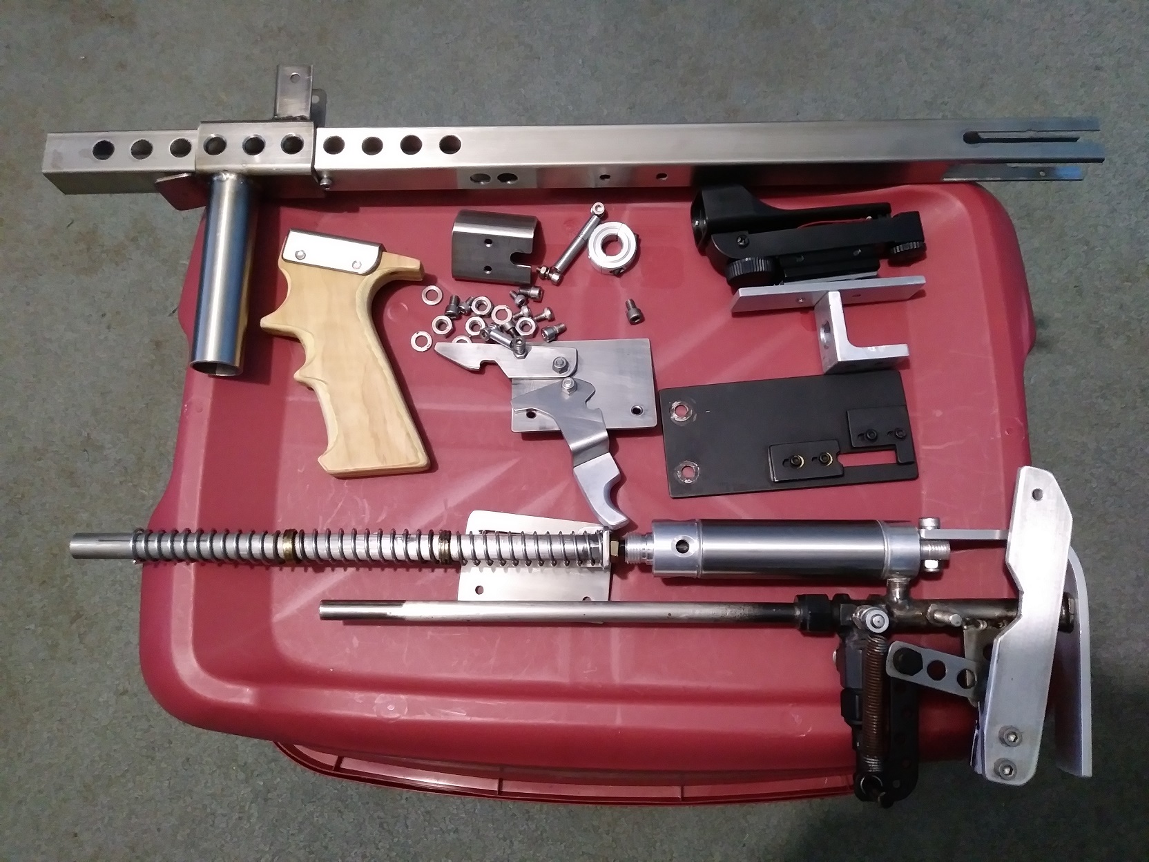 A bit of progress, bracket in the middle is for the grip, sprig guide needs a locking collar for the charge handle to push on, trigger not figured out yet or linkage to rear to load.