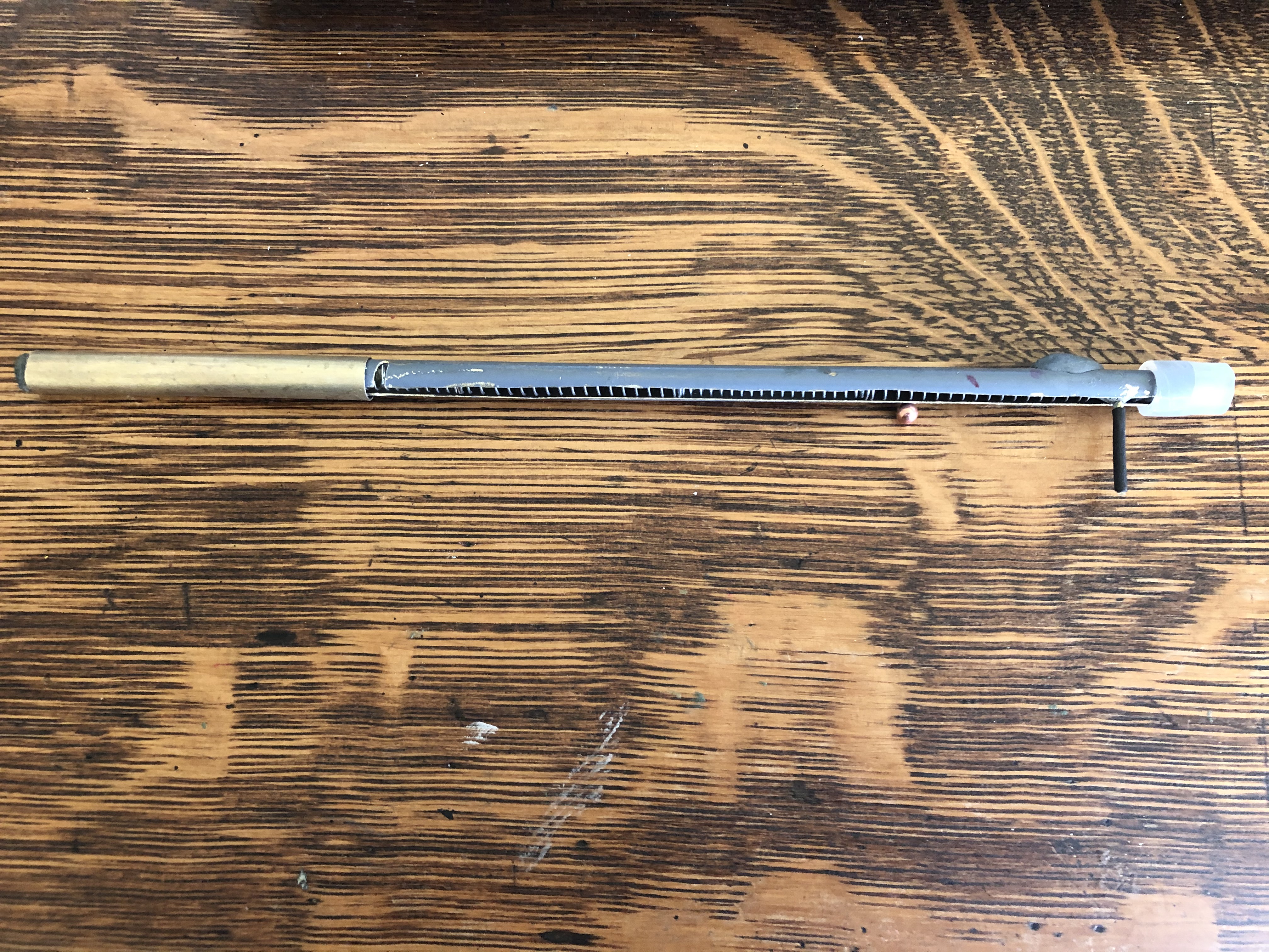 This is a crude magazine I've cobbled together with some brass pipe, compression springs, epoxy and heat shrink tubing. The capacity is about 50 .177 bbs. There's a large "L" shaped groove I cut to allow the follower to push bbs into the barrel.