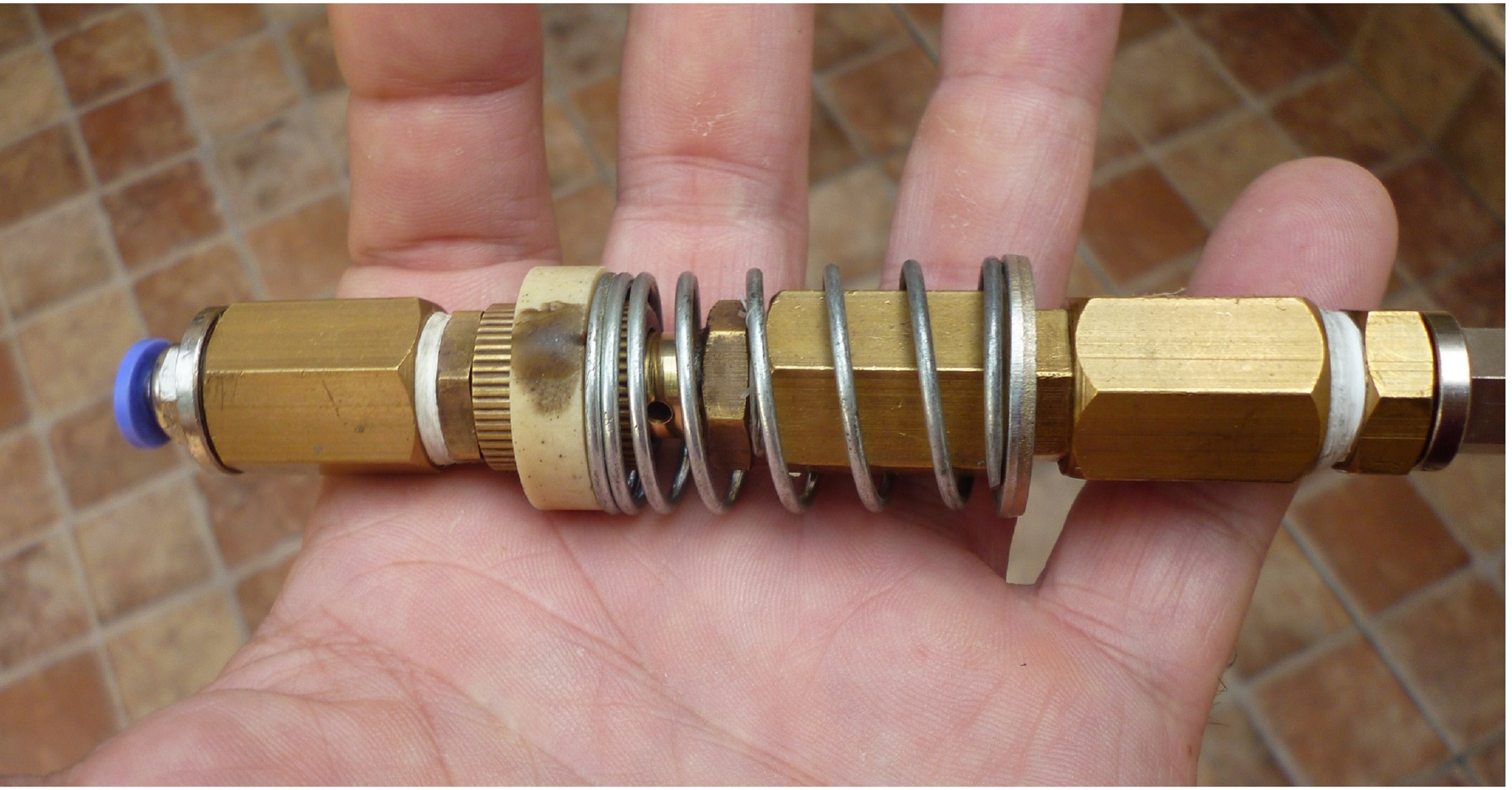 This is the valve that lets the butane pass into the dispenser when it is activated by compressed air. There are commercial ones, but I prefer to make it myself, because they are very cheap and I can repair them.