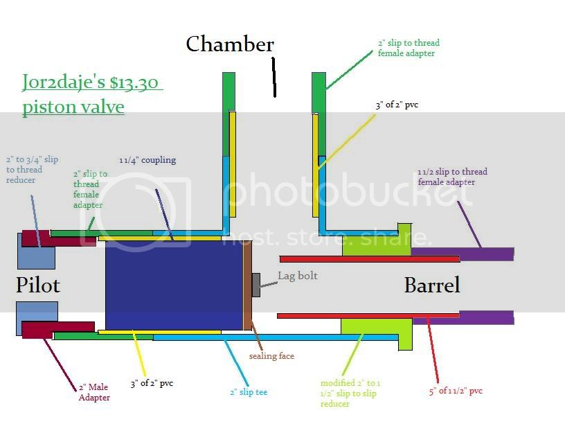 But I don't really see an advantage to using an air cylinder over a normal piston valve design like the one I attached. Piston valves generally don't need to move more than 1/2" to get more than enough flow and savvy spudgun designers minimize the distance of piston travel and the volume of an that has to be vented to move the piston, this helps the piston to open as fast as possible.