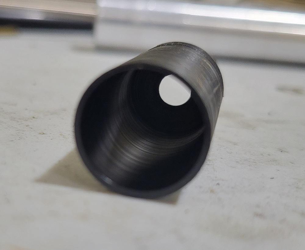 Some experimentation was definitely in order, so I machined a Delrin cup to fit the chamber with a 1/4" orifice through the base:
