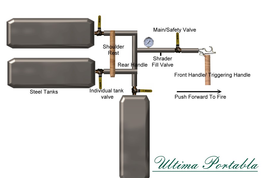 So, basically, you have three tanks hooked to one filling port. You fill up all three tanks at once, then seal them all off individually. Once one gives out, you go to another, and so on. The valve up front is for a safety. The handle in front is a piece of wood attached to the blowgun, so you just push it forward to fire. I was planning to use this setup mostly for a marble gun or and airsoft gun. I would probably need to make a few modifications, but that is my basic idea.