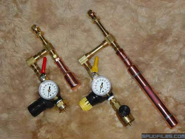 The spudgun featured here is the one I call "Little Bang." It has an approximately 1500ml chamber and a 46.5" long 1" diameter double walled barrel. The C:B ratio is about 2.35:1. Despite its name, it is really loud. As with BigBang III the construction of the chamber is completely double walled.