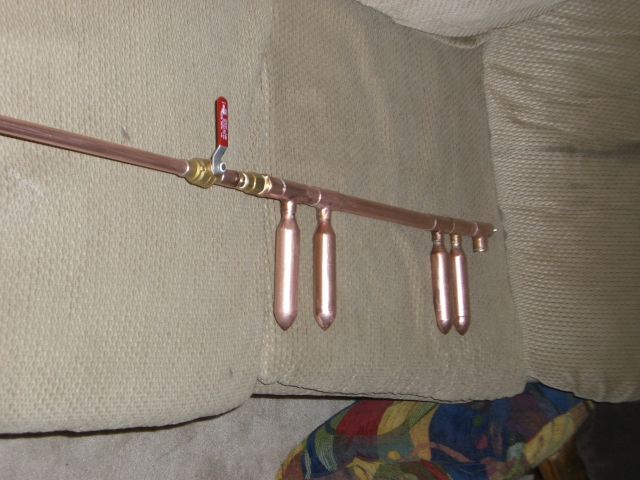 It is awkward. It's designed to lay across the shoulder so I can use my right hand to steady it by gripping the front chamber, and the left hand to throw the valve which allows me to sight directly down the barrel.pyromaniac wrote:better then my first but the design is a little awkward. Never seen copper fittings like that.