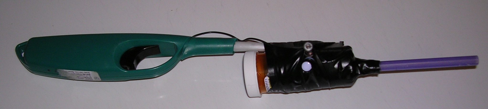 this is so similar to the one im doing and the one my friend did. ive been having problems though cause mine got to many holes in it. anyways, what we did is we took apart the lighter to get the sparker ( which is most common). it makes it smaller to and it makes it look like one piece. and you dont hafta push the two buttons