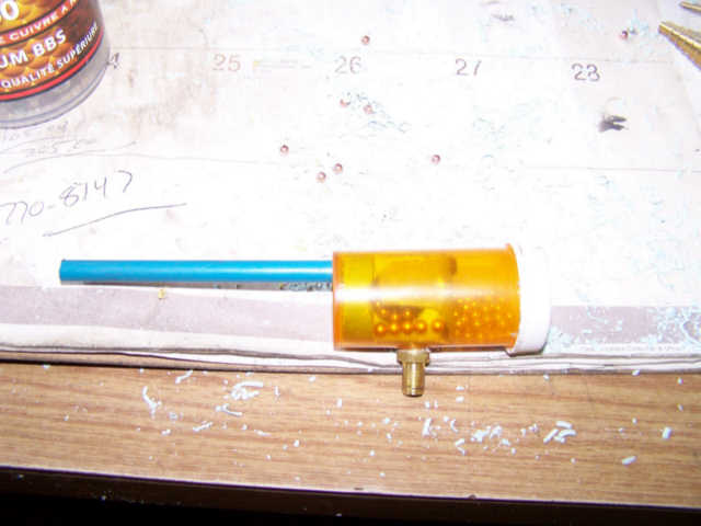 It looks like a pen barrel, but I could be wrong.  Is that magazine a pill container?  That's pretty clever.  I assume you connect that threaded part at the bottom to an air source?