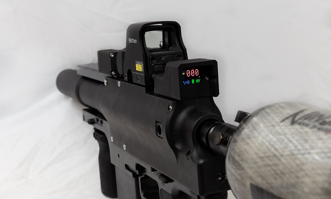 The current fuze is capable of both time based and turn counting activation(or hybrid). We are finishing testing of the time based features then will begin testing with the latest turn counter chip that will give us true binary data(the last one recorded dips and peaks but required more complex code). We take into account weight, pressure, and custom ballistic curve that we determine from mm accurate doppler data. We have a +/-3fps shot to shot consistency but can also incorporate adjustments for ballast pressure variation or atmospheric pressure. Just building up databases now. Each round has it's own unique identification and can upload ballistic data or other pertinent information to the launcher such as weight, type of round, etc..(this will be useful in remote multishot systems) The rounds are charged in the split second after the breech is closed so no batteries to worry about. You can let the LRF continuously update the fuze or lock the LRF and add or subtract offset for detonation meter at a time. The gun does all the calculations and just sends the round timing and/or turn count data. We also have RF data link capability with an added daughter board. The rounds also have the option of being self chronographing to further fine tune timing data. At one point we were using induction charging but the direct link gives us a faster rate of fire for multi-shot systems. Adding some mechanical safeties to comply with mil-std but will have multiple versions based on use and requirememts. The basic version is not designed for potentially lethal applications, but as a low cost fuze alternative for non and less lethal use. At some point they could qualify for use with lethal systems but right now we are focused on providing a safer way of deploying OC, flash bangs, and anti-drone countermeasures. We are currently using a small picatinny rail mounted OLED for data feedback but plan on incorporating into electronic scope system.
