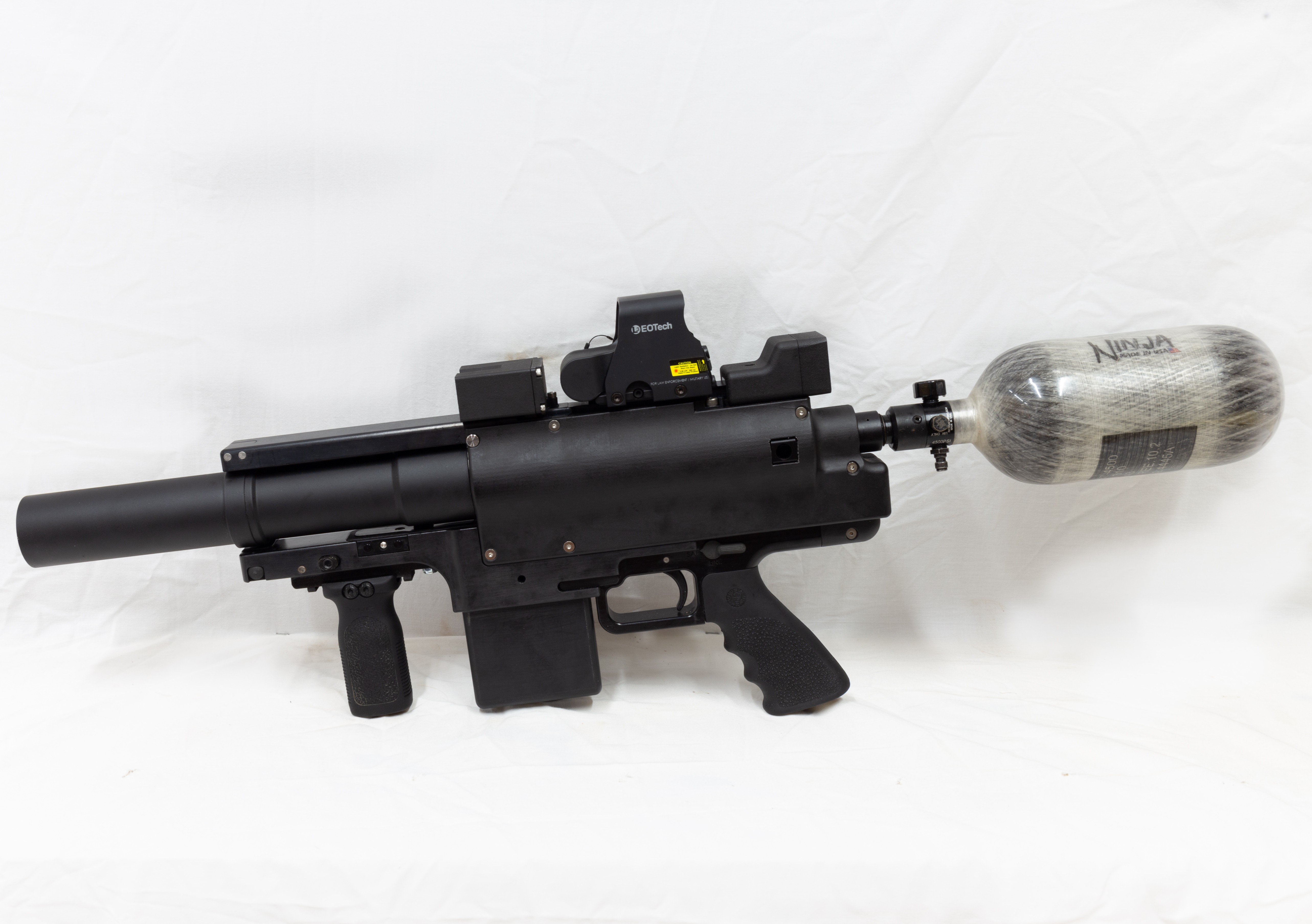 Latest electro-pneumatic with automated velocity control and laser range finder. Air burst system optional. FCU has electronic pressure sensor, firing, round charging and programming based on LRF data.